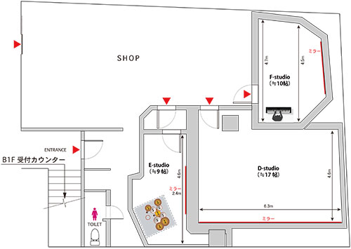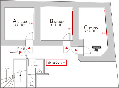 1FスタジオDst.、Fst.はドラムを設置していません。 Dst.は、ダンス、フラ、ヨガ等のレッスンや練習に適しています。 Fst は、ボーカル、DTM等のレッスンやボーカルの個人練習に適しています。 Est.は、ドラムセットは常設していますが、アンプの常設をしていません。ドラムレッスン、ドラム個人練習でご予約ください。 バンド練習はB1のスタジオをご予約ください。